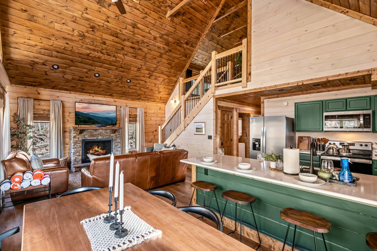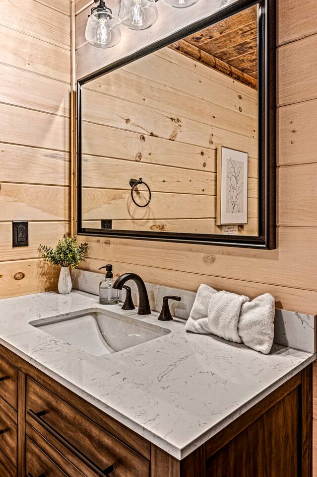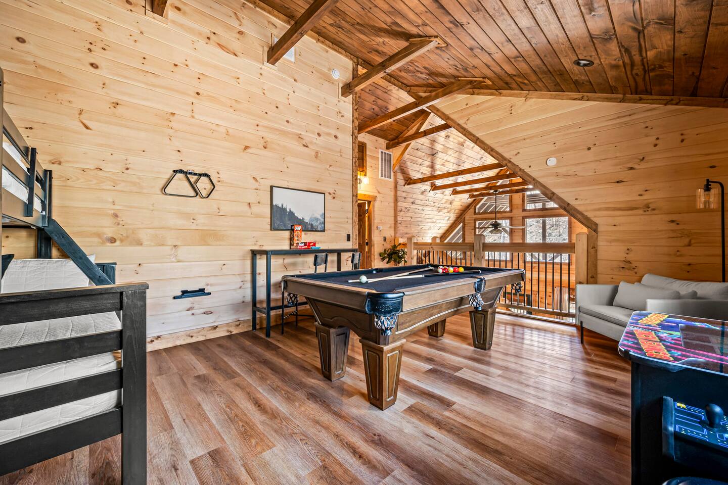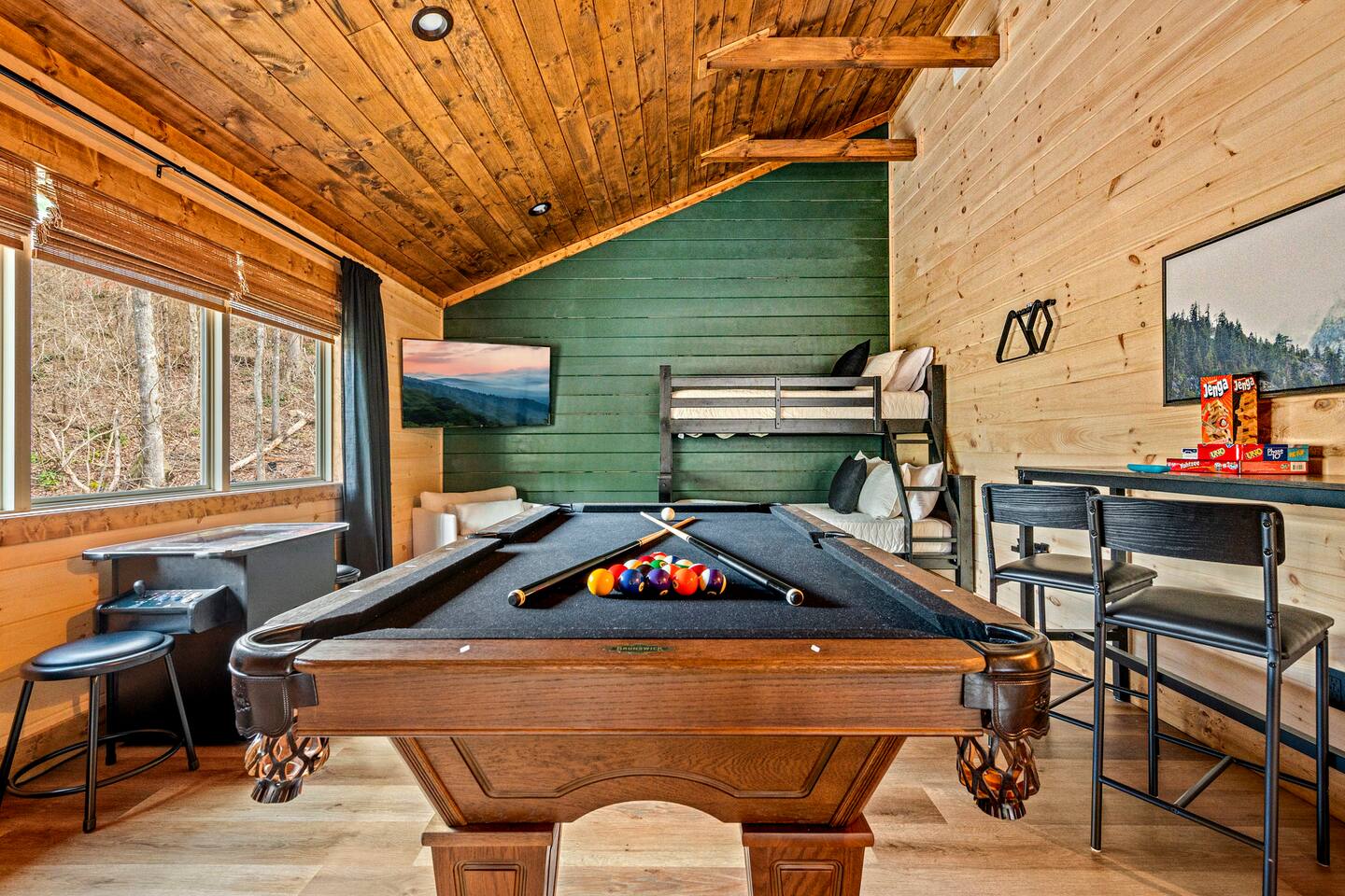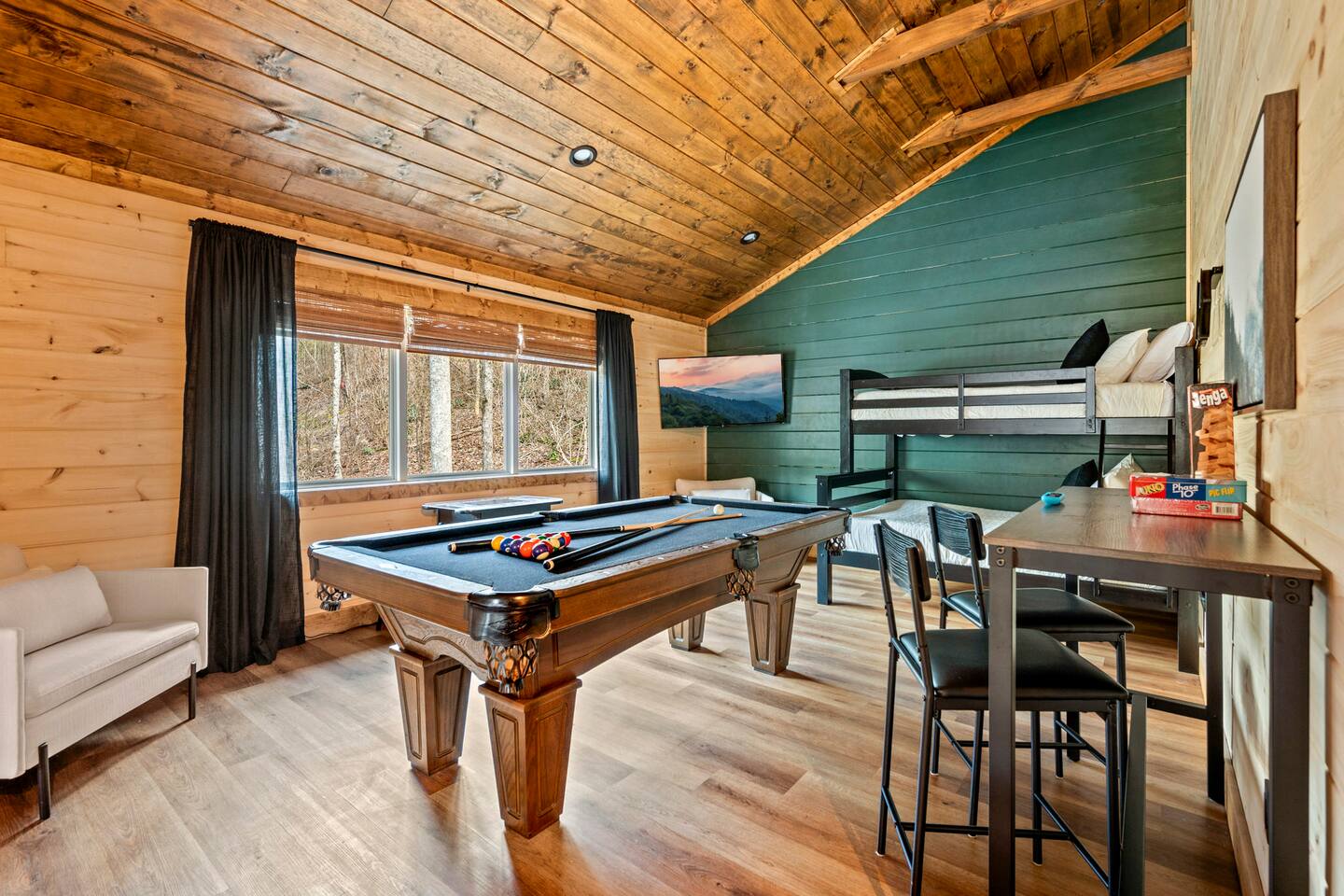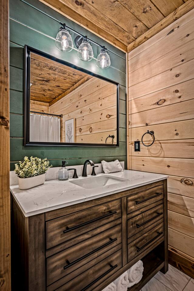 Unwind in our stunning modern and cozy cabin located in the heart of Tennessee's Great Smoky Mountains. There's space for everyone to relax after a long day of adventure either inside or in our outdoor pavilion. ** Main Level ** ★ 2 King BR each with Ensuite Bathroom ★ Roku TV in each Bedroom & Living Room ★ Fully equipped kitchen ★ Keurig & Drip Coffee Maker (BYO K-Cups and/or coffee) ★ Dining area with seating for up to 10 people ★ Living area ★ Washer & Dryer ** Upper level *** ★ 1 BR with King Bed with Full Ensuite Bathroom ★ Loft with Twin over Full Bunk ★ Roku TV in Loft & Bedroom ★ Pool table & Shuffle Board Game ★ Arcade, Wall Connect Four, & Board Games ★ Work space area **Outdoor Area** ★ Hot Tub ★ Pavilion with wood-burning fireplace ★ Roku TV for your enjoyment ★ Park style grill ★ Dining area with string lights & rocking chairs ★ Parking for up to 4 cars Our starter kit provides: ★ Few Laundry Pods and dishwashing pods ★ Cooking Oil Spray ★ Salt & Pepper ★ 1 Kitchen sponge ★ Coffee pods ★ Sugar, sweet & low ★ Coffee creamer ★ Toilet tissue in each bathroom ★ Few trash bags ★ 1 Roll of Paper Towel Please note that by booking the cabin you agree to our house rules and Rental Agreement which will be sent in your booking confirmation email for signature. The booking guest is required to sign the Rental Agreement within 24 hours of booking. We encourage you to message us if you have any questions about this requirement. We know that pets are cherished members of the family. That's why we welcome your furry companions. However, we ask our guest to follow our house rules. Please review them to confirm they align with you. Please be aware that our cabin is in the Great Smoky Mountains, and in spite of regular pest control you may encounter various insects. We request you keep all doors and windows closed to minimize insects inside the cabin. No Smoking Policy: Smoking is strictly prohibited INSIDE the cabin. The cabin is equipped with a smoke monitoring device designed to detect cigarette/vape smoke. Violation of this policy will result in the immediate termination of the booking and a $500 charge for deep clean. Firewood and/or charcoal is Not provided. You may purchase firewood and/or charcoal at Ace Hardware near the cabin or any nearby store. Wi-Fi is available; however, connectivity may be impacted given our mountainous surroundings. We are here to assist you and make your stay a memorable one. Upon booking with us you will receive a digital guidebook with all things to know about the cabin as well as a list of our favorite places to eat and visit.