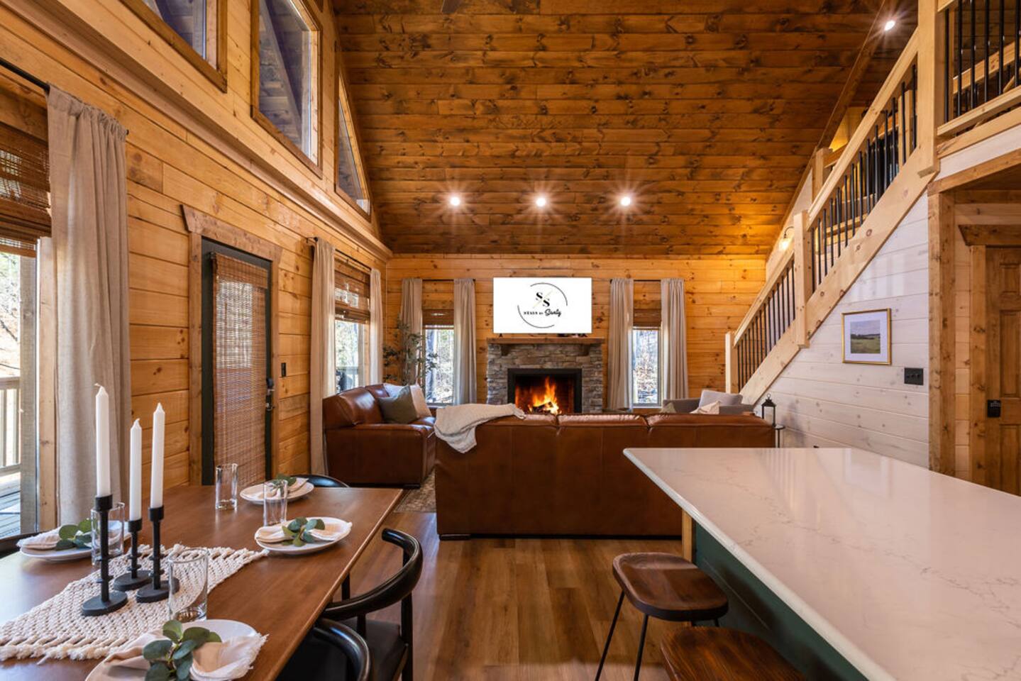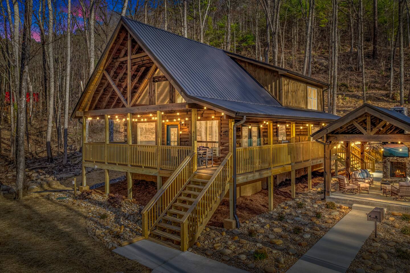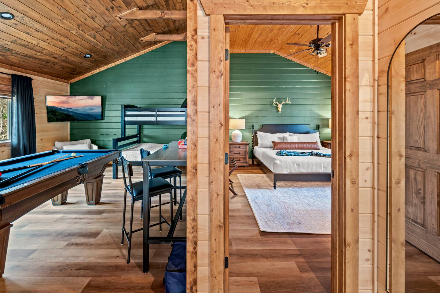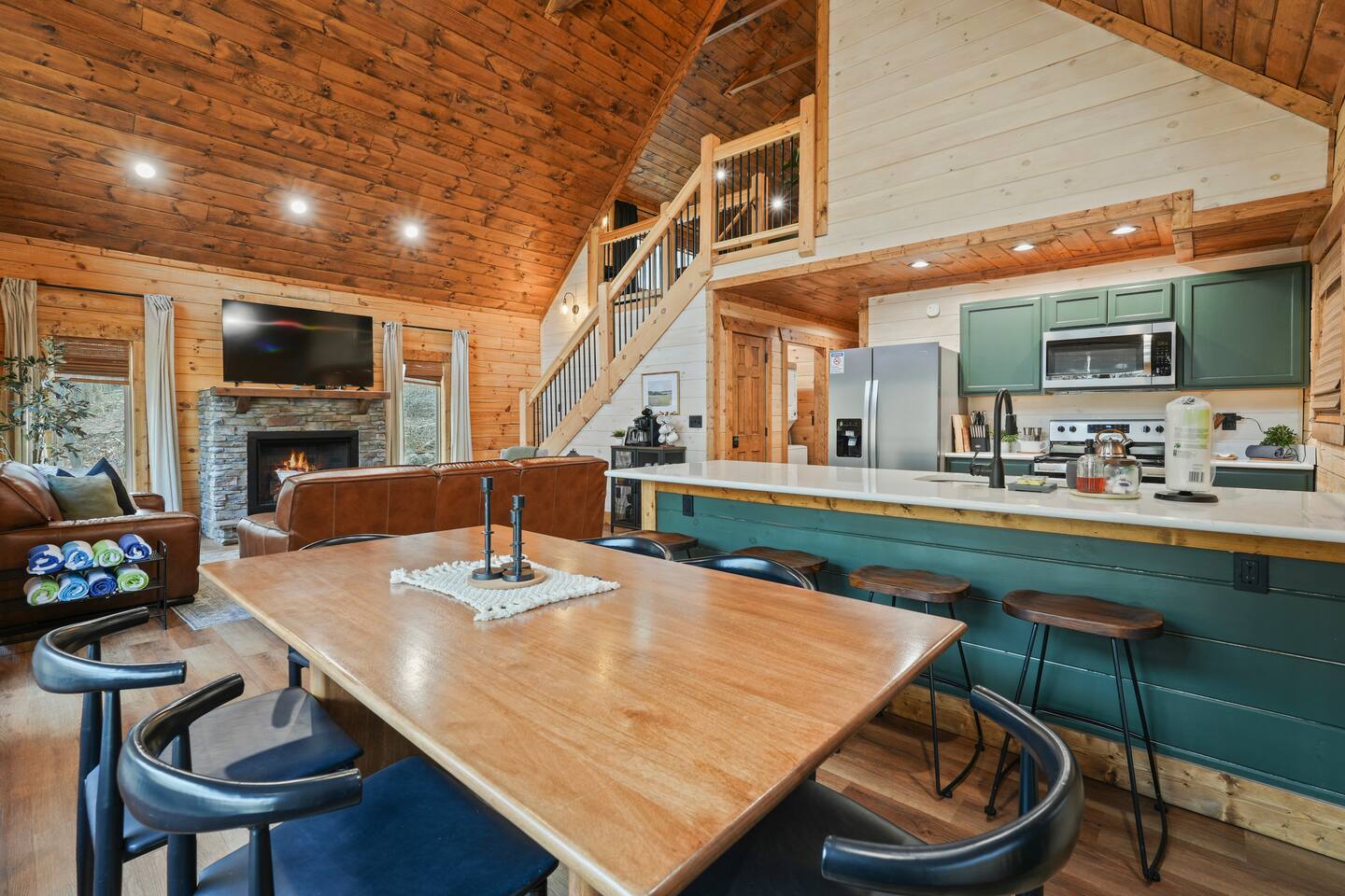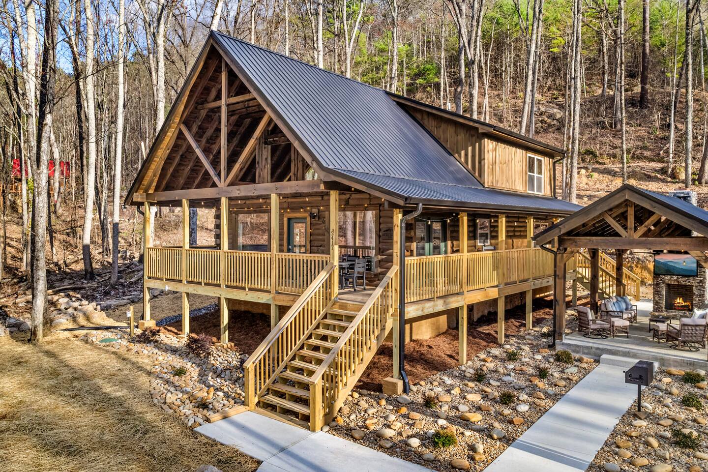 Unwind in our stunning modern and cozy cabin located in the heart of Tennessee's Great Smoky Mountains. There's space for everyone to relax after a long day of adventure either inside or in our outdoor pavilion. ** Main Level ** ★ 2 King BR each with Ensuite Bathroom ★ Roku TV in each Bedroom & Living Room ★ Fully equipped kitchen ★ Keurig & Drip Coffee Maker (BYO K-Cups and/or coffee) ★ Dining area with seating for up to 10 people ★ Living area ★ Washer & Dryer ** Upper level *** ★ 1 BR with King Bed with Full Ensuite Bathroom ★ Loft with Twin over Full Bunk ★ Roku TV in Loft & Bedroom ★ Pool table & Shuffle Board Game ★ Arcade, Wall Connect Four, & Board Games ★ Work space area **Outdoor Area** ★ Hot Tub ★ Pavilion with wood-burning fireplace ★ Roku TV for your enjoyment ★ Park style grill ★ Dining area with string lights & rocking chairs ★ Parking for up to 4 cars Our starter kit provides: ★ Few Laundry Pods and dishwashing pods ★ Cooking Oil Spray ★ Salt & Pepper ★ 1 Kitchen sponge ★ Coffee pods ★ Sugar, sweet & low ★ Coffee creamer ★ Toilet tissue in each bathroom ★ Few trash bags ★ 1 Roll of Paper Towel Please note that by booking the cabin you agree to our house rules and Rental Agreement which will be sent in your booking confirmation email for signature. The booking guest is required to sign the Rental Agreement within 24 hours of booking. We encourage you to message us if you have any questions about this requirement. We know that pets are cherished members of the family. That's why we welcome your furry companions. However, we ask our guest to follow our house rules. Please review them to confirm they align with you. Please be aware that our cabin is in the Great Smoky Mountains, and in spite of regular pest control you may encounter various insects. We request you keep all doors and windows closed to minimize insects inside the cabin. No Smoking Policy: Smoking is strictly prohibited INSIDE the cabin. The cabin is equipped with a smoke monitoring device designed to detect cigarette/vape smoke. Violation of this policy will result in the immediate termination of the booking and a $500 charge for deep clean. Firewood and/or charcoal is Not provided. You may purchase firewood and/or charcoal at Ace Hardware near the cabin or any nearby store. Wi-Fi is available; however, connectivity may be impacted given our mountainous surroundings. We are here to assist you and make your stay a memorable one. Upon booking with us you will receive a digital guidebook with all things to know about the cabin as well as a list of our favorite places to eat and visit.